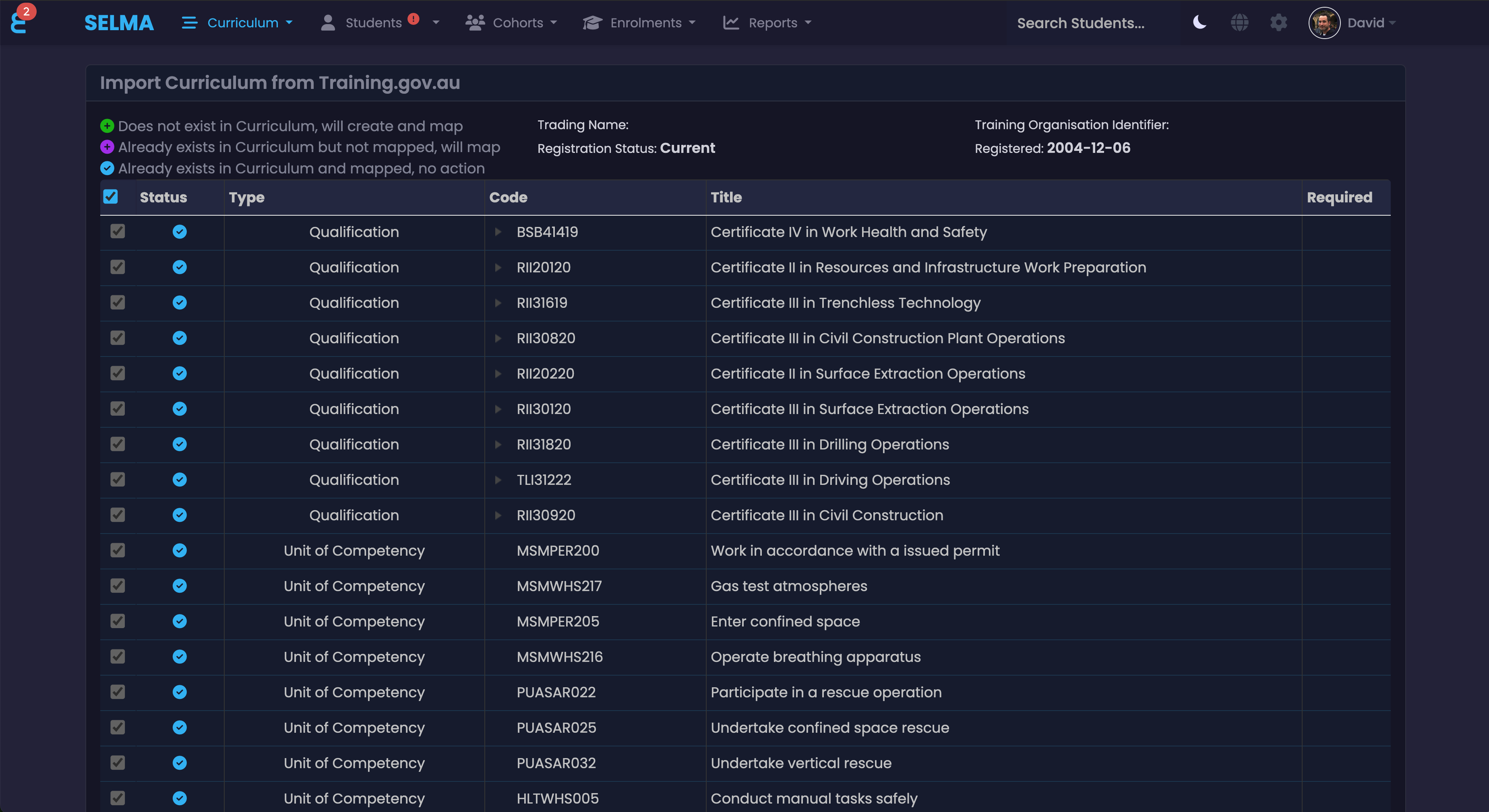 SELMA integrates seamlessly with Training.gov.au by allowing institutions to import and map qualifications and units of competency directly into their curriculum. The system automatically identifies new or existing entries and updates mappings where necessary, streamlining compliance with Australian standards. This ensures that training organisations maintain an accurate, up-to-date curriculum aligned with national requirements, enhancing operational efficiency and reducing administrative overhead.