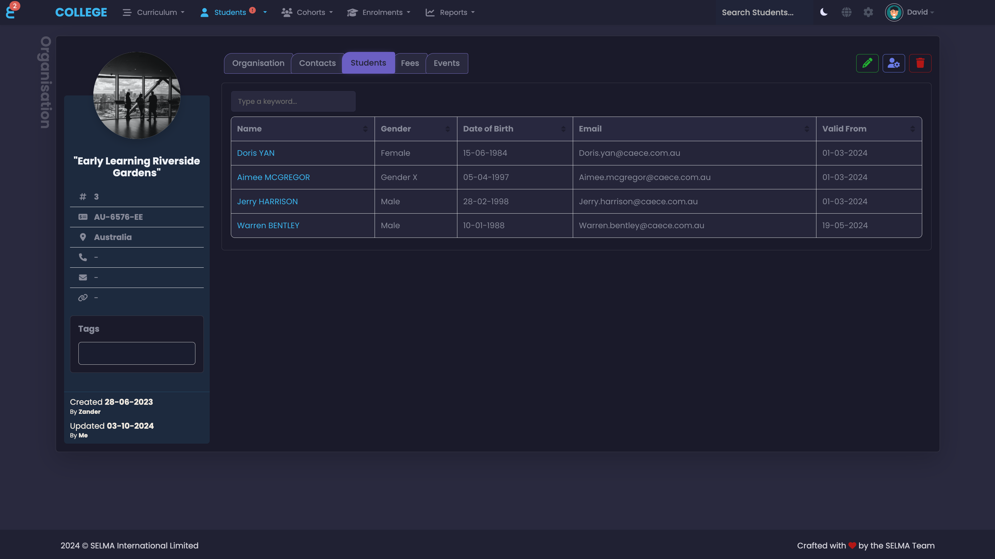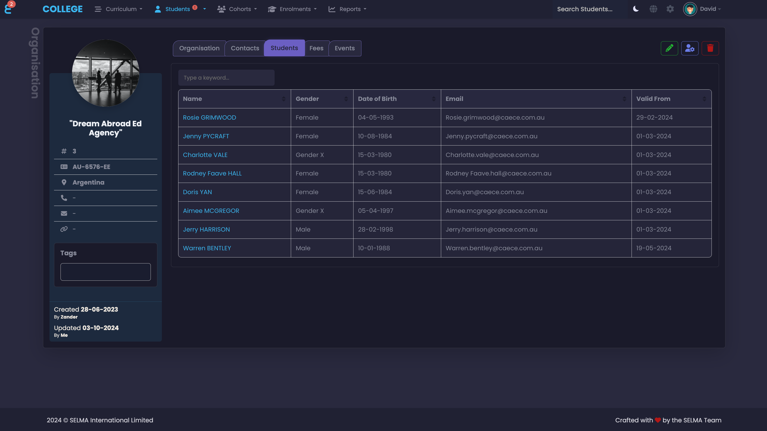 SELMA SIS provides a student portal for access to academic records, course materials, enrolment info, timetables, and assignment submissions, with links to other applications like LMS or document storage. The employer portal allows employers to track student progress, manage placements, and stay updated on changes to their apprentices’ or trainees’ studies. The agent portal enables international agents to assist with admissions by accessing student and programme information, tracking admissions progress, and helping with application forms in real-time.