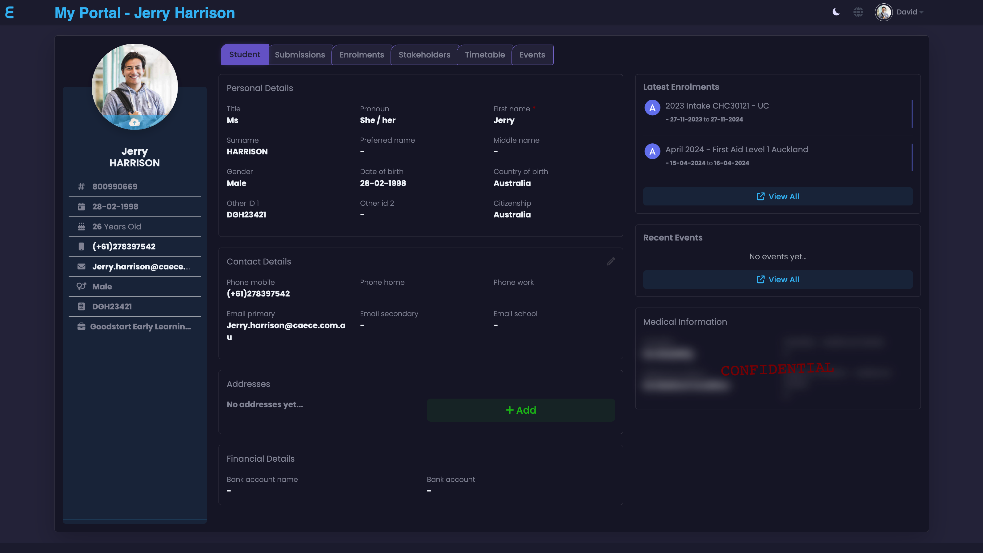 The student portal provides students with access to their academic records, course materials, enrolment information, and personal details. Students can view timetables, submit assignments, and monitor their academic progress via this self-service platform. The portal is also a fantastic dashboard to link any other application you may use such as learning management system or document storage.