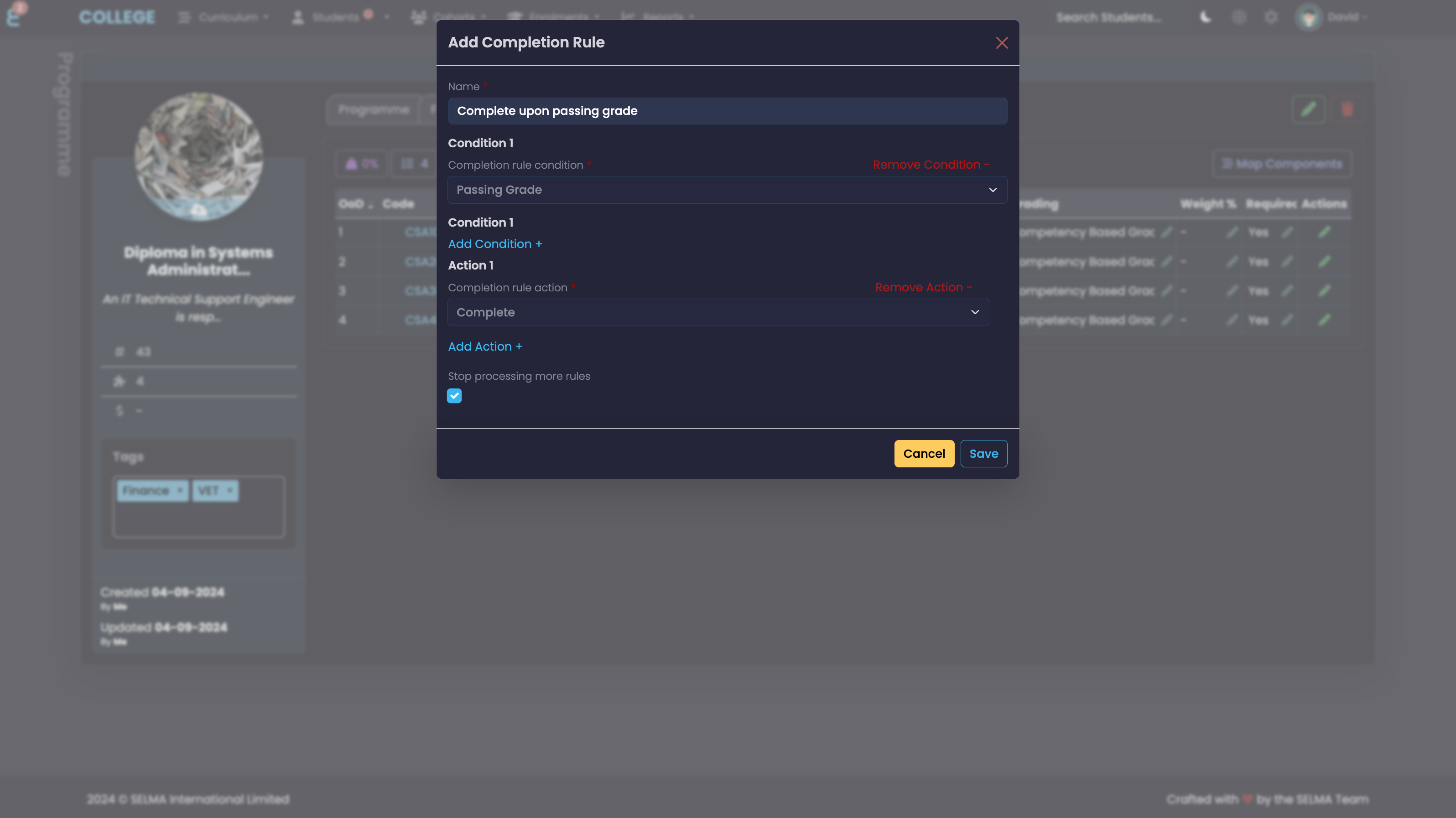 SELMA SIS defines and enforces completion rules for courses and programmes, such as minimum attendance, passing specific assessments, or completing a required number of credits. The system tracks student progress against these rules, notifying administrators or students when they are nearing completion or failing to meet requirements.