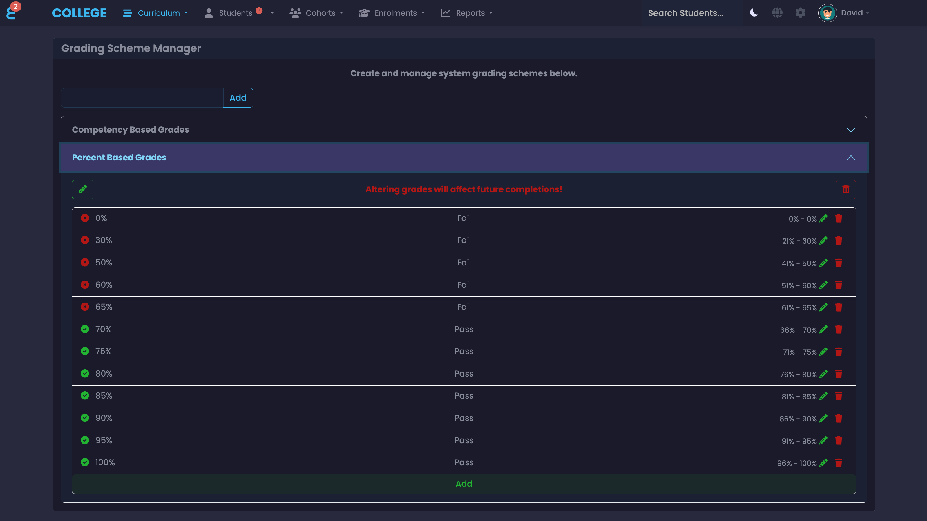 SELMA SIS enables institutions to implement customised grading schemes, offering tools for setting up scales, calculating grades, and ensuring consistency. It automates final grade calculations based on assignment and exam weightings, and supports competency-based marking for vocational programmes. Additionally, SELMA SIS enforces completion rules, tracking student progress and notifying administrators or students when requirements are met or at risk of falling short.