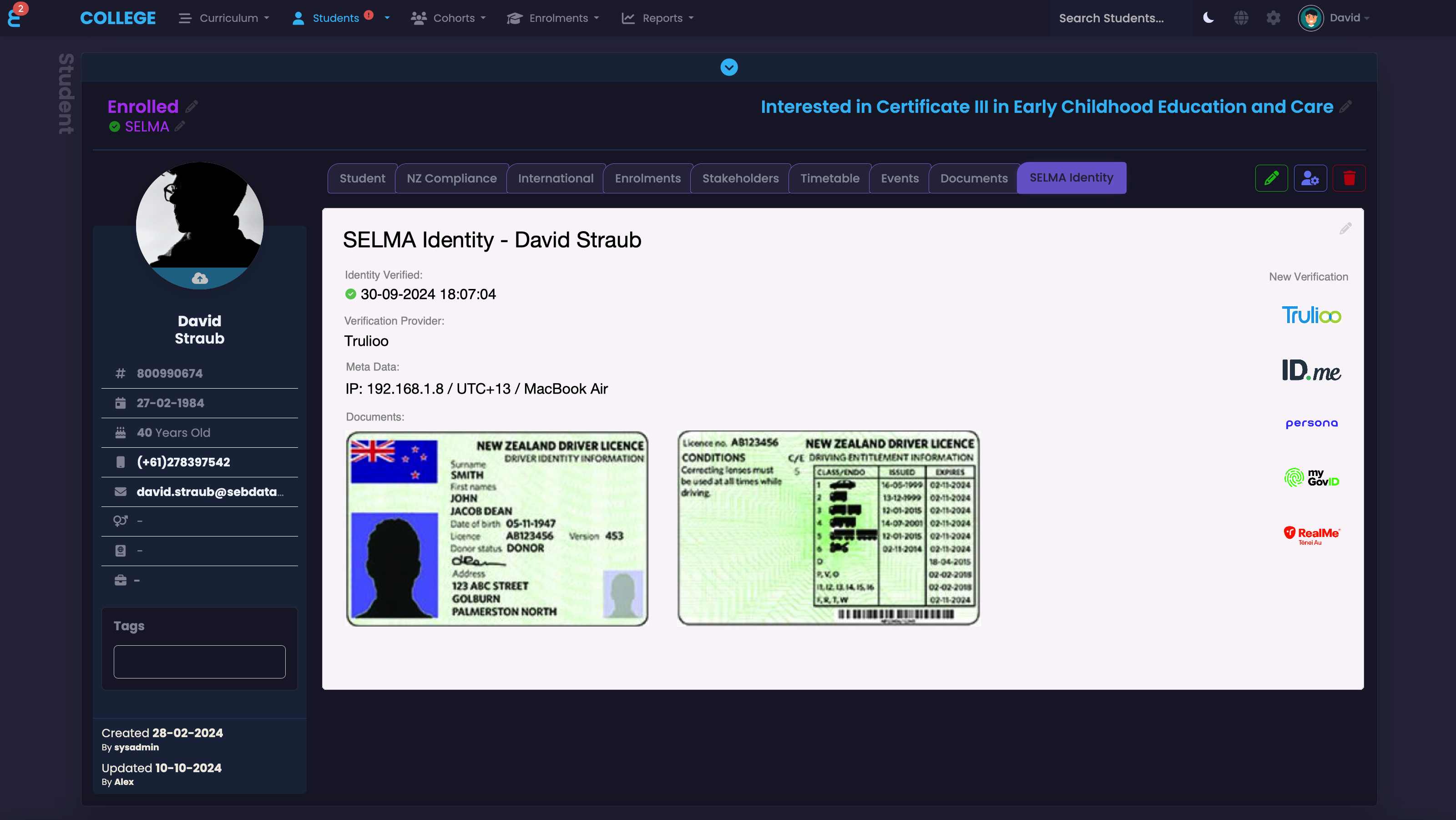 SELMA SIS supports identity verification processes, ensuring that students and staff members are authenticated properly. This may involve integration with external identity verification systems, such as RealMe or Persona.